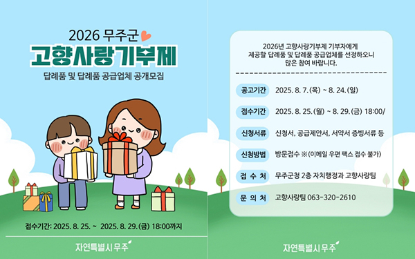 [경제=뉴전북] 무주군이 고향사랑기부제 활성화를 위해 오는 29일까지 답례품 및 공급업체를 공개 모집한다고 밝혔다.