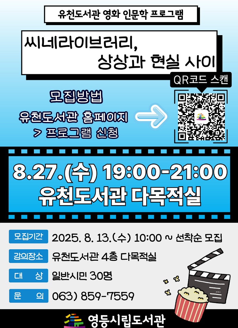 • - 8월 27일, 강연 '씨네라이브러리, 상상과 현실 사이' 운영 - 오는 13일부터 익산시 통합도서관 누리집에서 참여자 모집