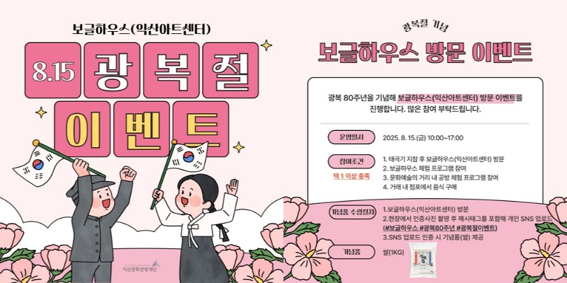 이날 보글하우스(익산아트센터)와 문화예술의 거리 일원에서도 광복 80주년 기념행사가 오전 10시부터 오후 5시까지 열린다.