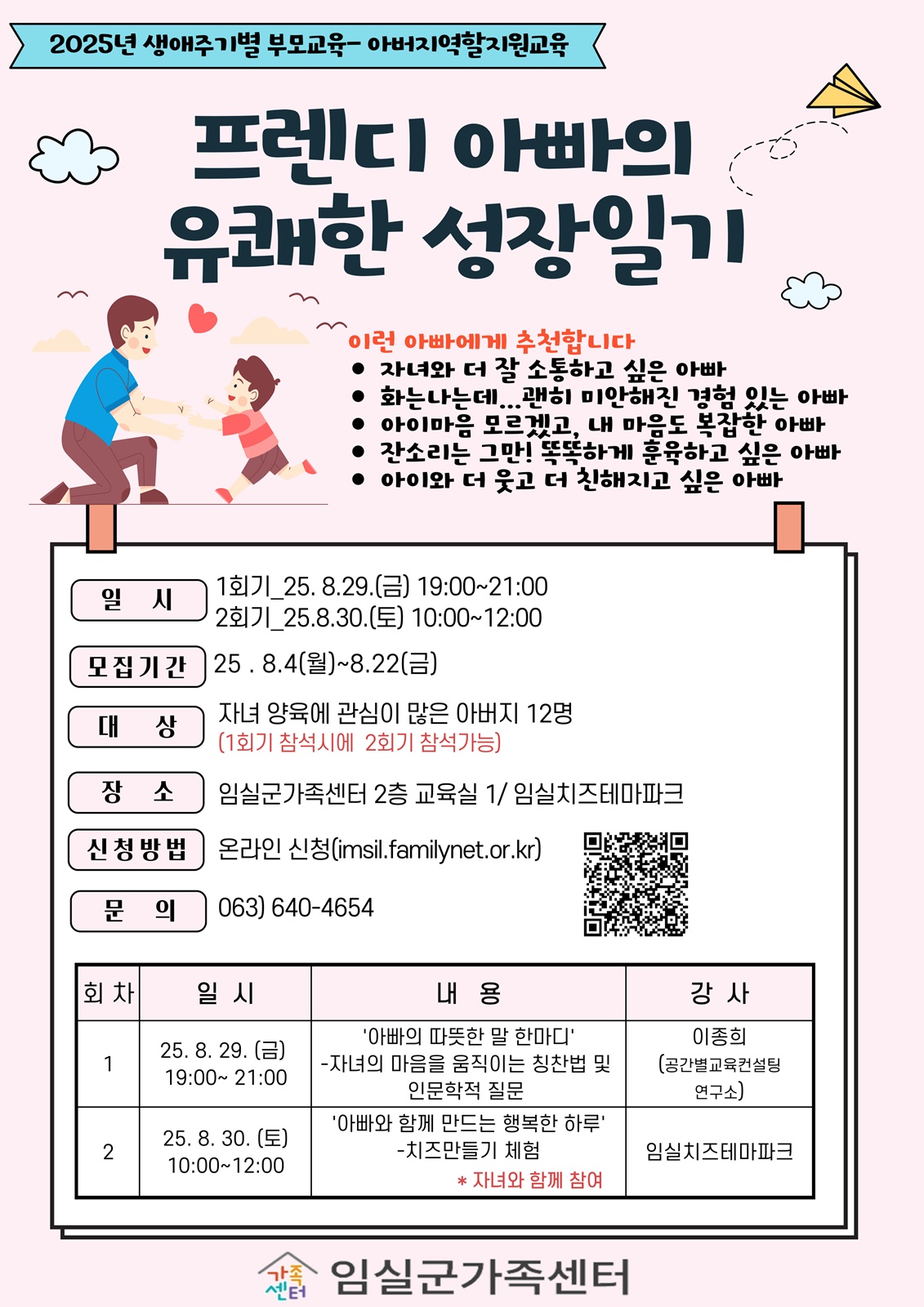 아버지 교육 1회기는 29일 저녁 7시 임실군가족센터 교육실에서 진행되며, 이종희 공간별 교육컨설팅연구소장을 초청해 ‘자녀의 마음을 움직이는 칭찬법 및 인문학적 질문’을 주제로 강의를 진행한다.