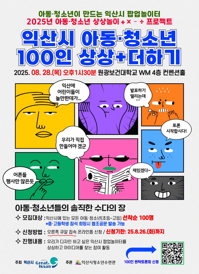 원탁회의 참여는 오는 26일까지 익산시청소년수련관 누리집에 게시된 큐알(QR)코드를 통해 신청하면 한다. 더욱 자세한 내용은 누리집을 참고하거나 전화(063-838-1700)로 문의하면 된다.