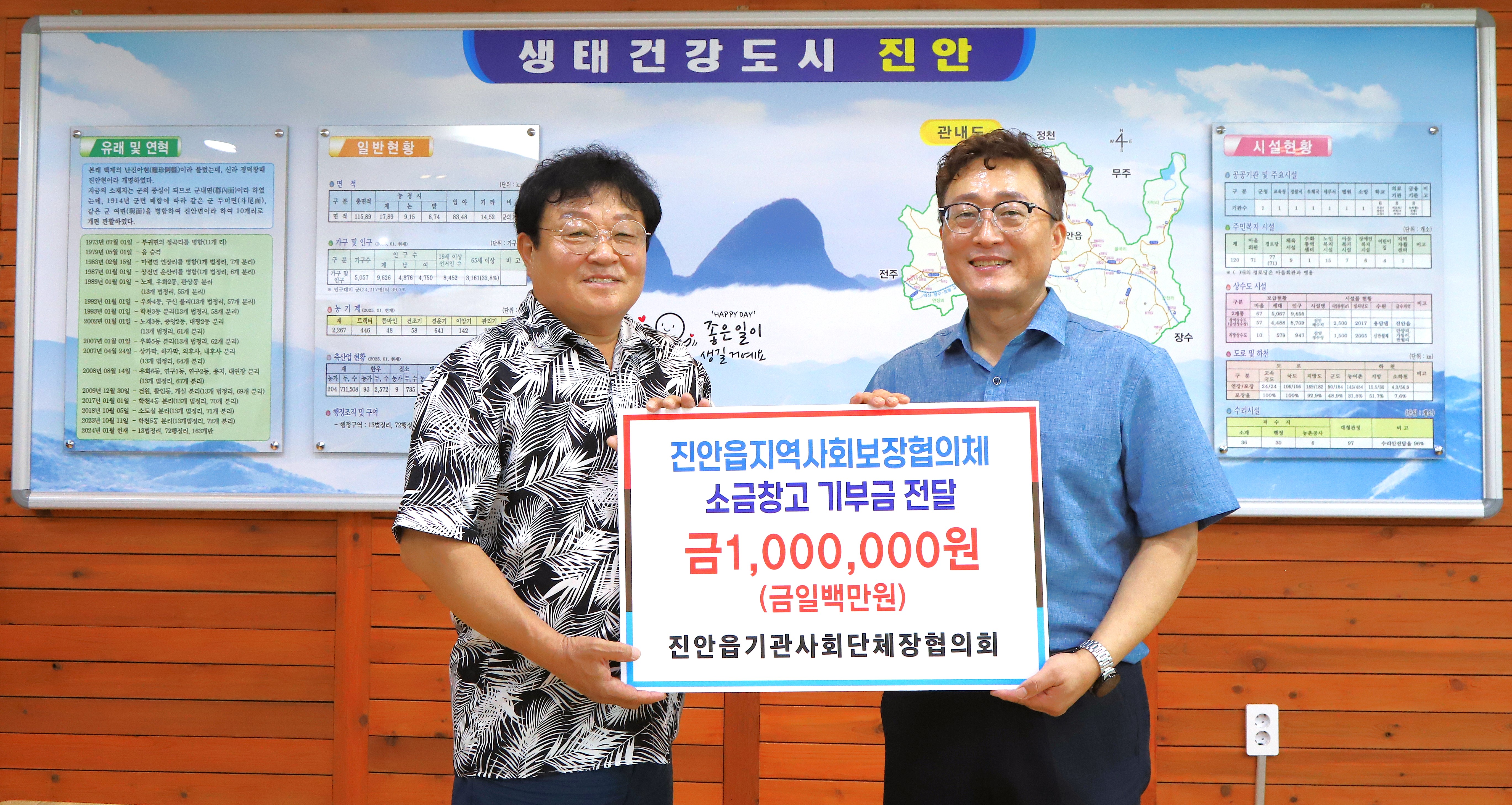 진안읍 주요 기관 및 단체장 34명으로 구성되어 상호 이해증진과 애향화합을 바탕으로 지역의 안정과 발전에 기여하기 위하여 운영되고 있는 진안읍 기관단체협의회는 8월 월례회의에서 복지 사각지대에 놓인 어려운 이웃을 돕기 위해 소금창고에 100만원을 기부하기로 결정했다.