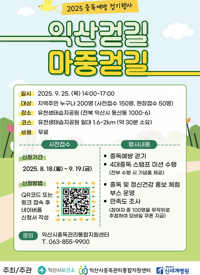 익산시는 중독관리통합지원센터(센터장 이현기)와 함께 오는 9월 25일 유천생태습지공원 일대에서 '2025 중독 예방 걷기 행사 – 익산걷길, 마중걷길'을 개최한다고 22일 밝혔다.