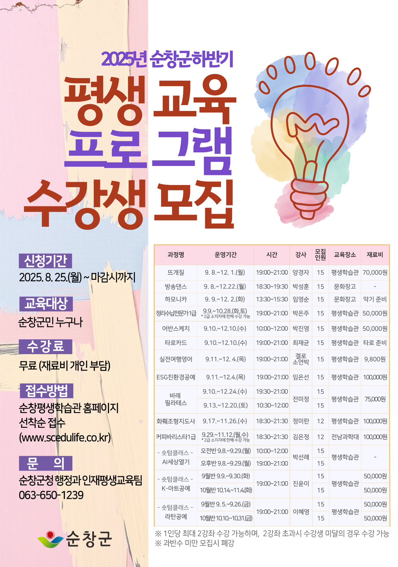 신청은 순창군 평생교육 홈페이지(www.scedulife.co.kr)에서 가능하며, 문의는 순창군청 행정과(063-650-1239)로 하면 된다.