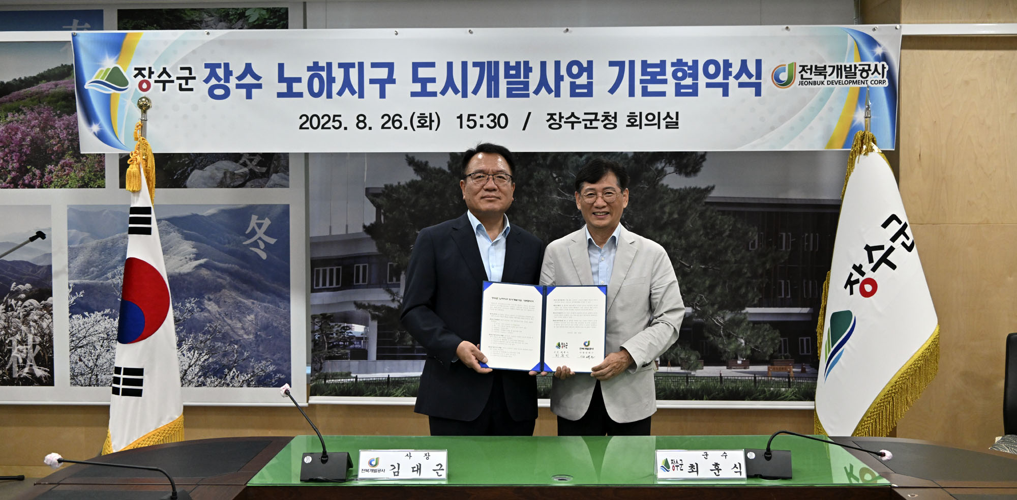 장수군은 지난 26일 군청 2층 회의실에서 최훈식 장수군수와 김대근 전북개발공사 사장 등 양 기관의 관계자들이 참석한 가운데 공동사업시행자인 전북개발공사와 ‘장수군 노하지구 도시개발사업’ 추진을 위한 기본협약을 체결했다.