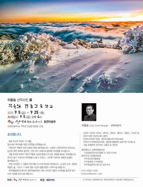 이윤승 작가는 “덕유의 겨울은 단순한 풍경이 아니라 마음을 감싸는 따듯한 위로”라며 “덕유산 겨울의 속삭임을 들으시며 더위를 잊어보시길 바란다”라고 전했다.