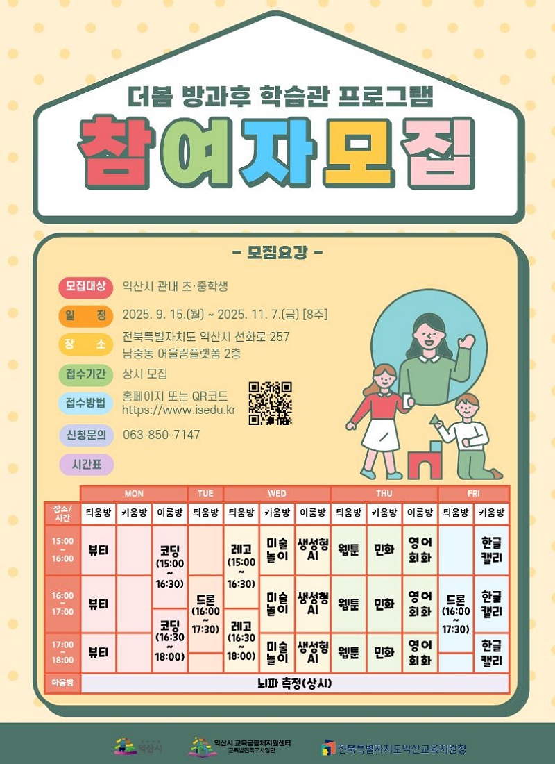 익산시 관계자는 "방과후학습관 '더봄'은 1기와 2기 운영을 통해 효과가 입증된 지역 맞춤형 교육 모델"이라며 "3기에서는 전통과 미래, 창의와 협업이 결합한 프로그램을 통해 학생들이 잠재력을 마음껏 발휘할 수 있도록 적극 지원하겠다"고 말했다.