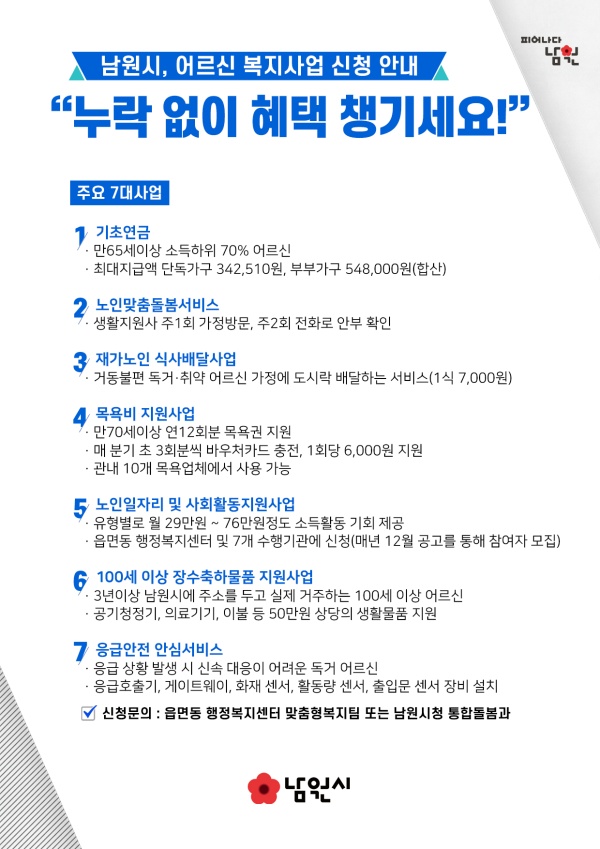 [정치=뉴전북] 남원시(시장 최경식)는 어르신들의 삶의 질 향상을 위해 다양한 노인복지사업을 추진하고 있다. 특히 신청을 통해 직접 혜택을 받을 수 있는 사업을 적극 홍보하며, 어르신들이 빠짐없이 신청하고 이용할 수 있도록 안내를 강화하고 있다. 각 사업 신청은 읍면동 행정복지센터에서 할 수 있다.