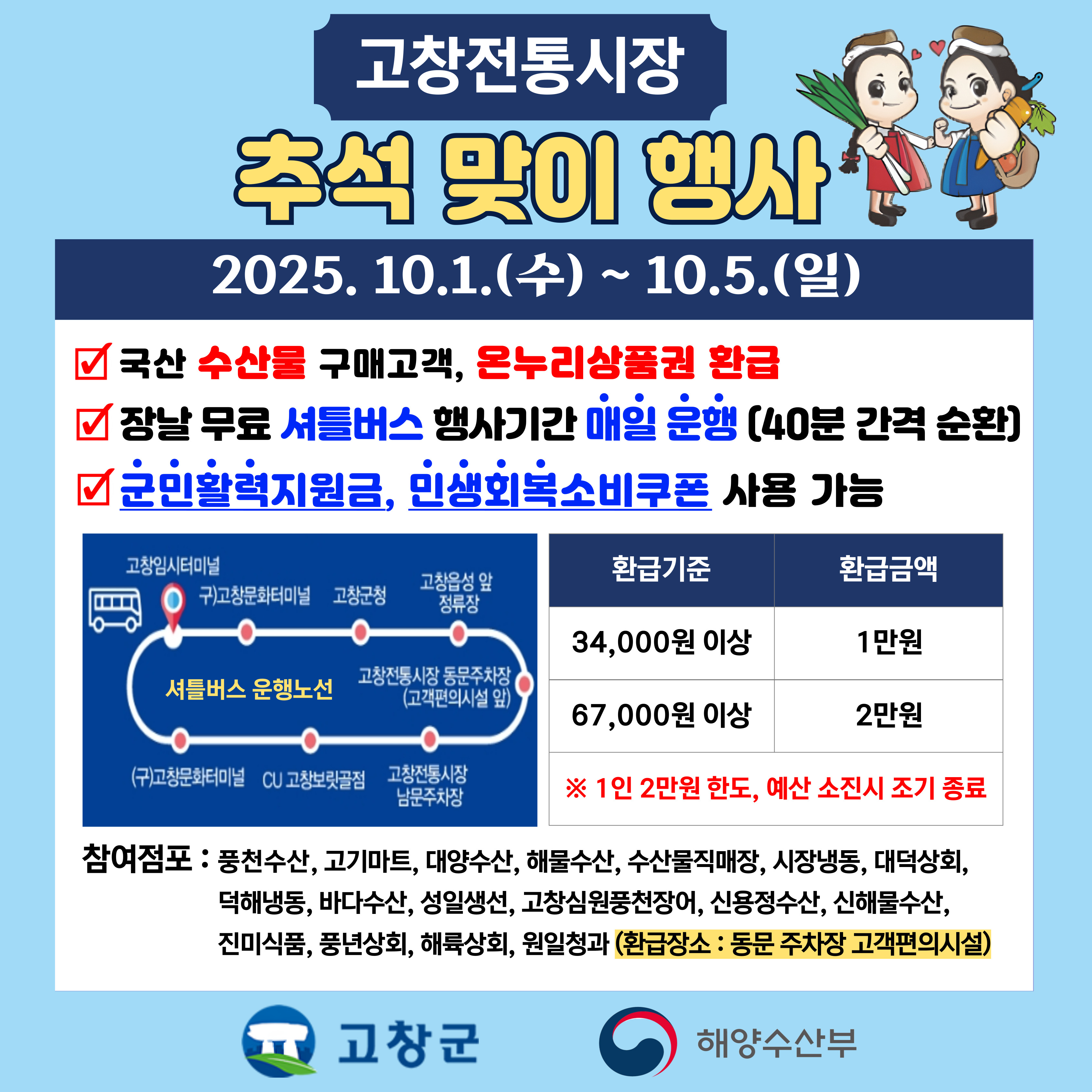 먼저, 기존 장날(매월 3·8일)에만 운영하던 고창전통시장 셔틀버스를 10월 1일부터 5일까지 추석 연휴 기간 동안 확대 운행한다. 이를 통해 군민과 귀성객의 교통 불편을 최소화하고 전통시장 접근성을 크게 높여 상권 활성화에 기여할 계획이다.