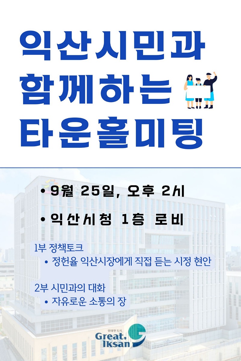 익산시는 오는 25일 오후 2시 시청 1층 로비에서 '시민과 함께하는 타운홀미팅'을 개최한다고 19일 밝혔다.