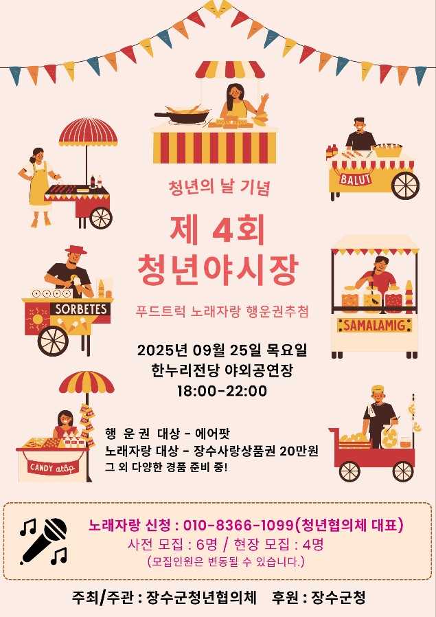 [장수=뉴전북] 장수군은 오는 25일 오후 6시부터 장수한누리전당 야외공연장에서 ‘제4회 청년의 날 기념 장수 청년 야시장’을 개최한다고 밝혔다.