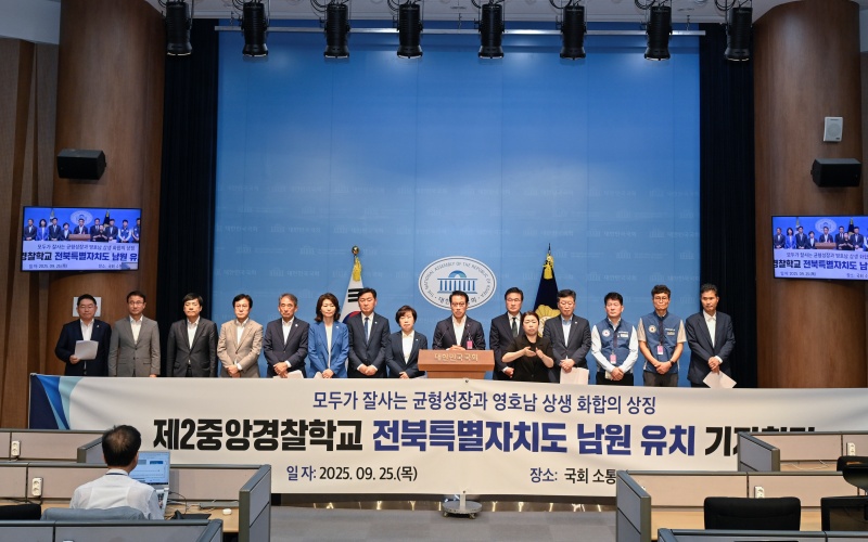 [정치=뉴전북] 전북특별자치도 국회의원과 전북 연고 및 영호남 국회의원들이 25일 국회에서 ‘제2중앙경찰학교 전북특별자치도 남원 유치 촉구 기자회견’을 가졌다. 이번 기자회견에는 최경식 남원시장과 전북특별자치도지사, 전국경찰직장협의회 민관기 위원장도 함께해, 전북특별자치도와 남원시, 정치권, 전국경찰직장협의회가 모두 뜻을 모았음을 보였다.