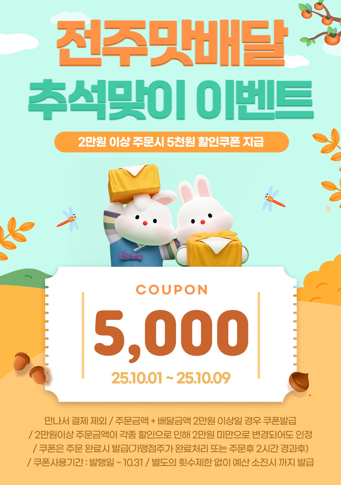 이번 추석 이벤트는 명절을 맞아 시민들이 지역 상권에서 보다 합리적인 가격으로 음식을 주문할 수 있도록 기획된 것으로, 발급된 쿠폰은 선착순 소진 시 조기 종료될 수 있다.