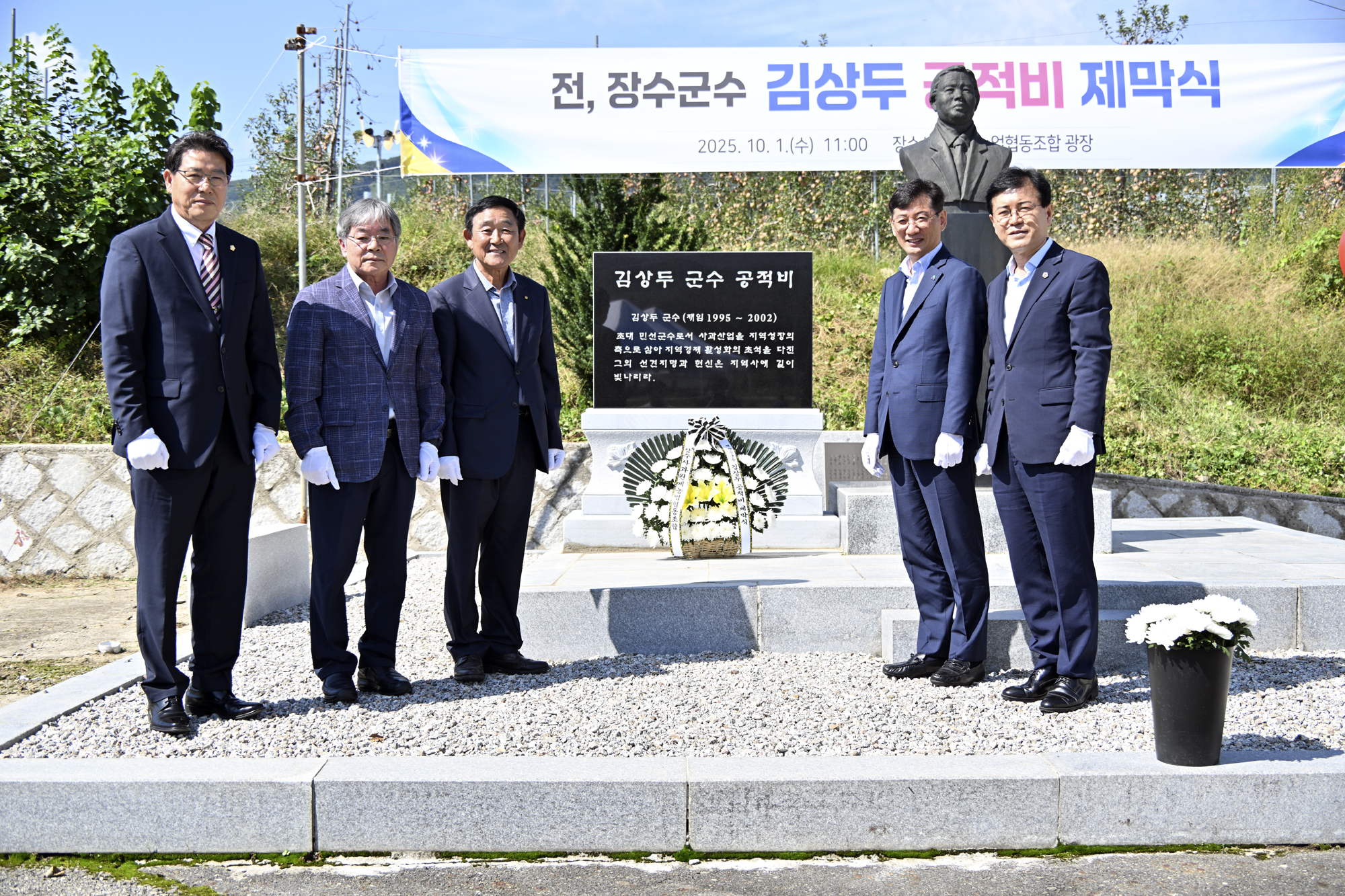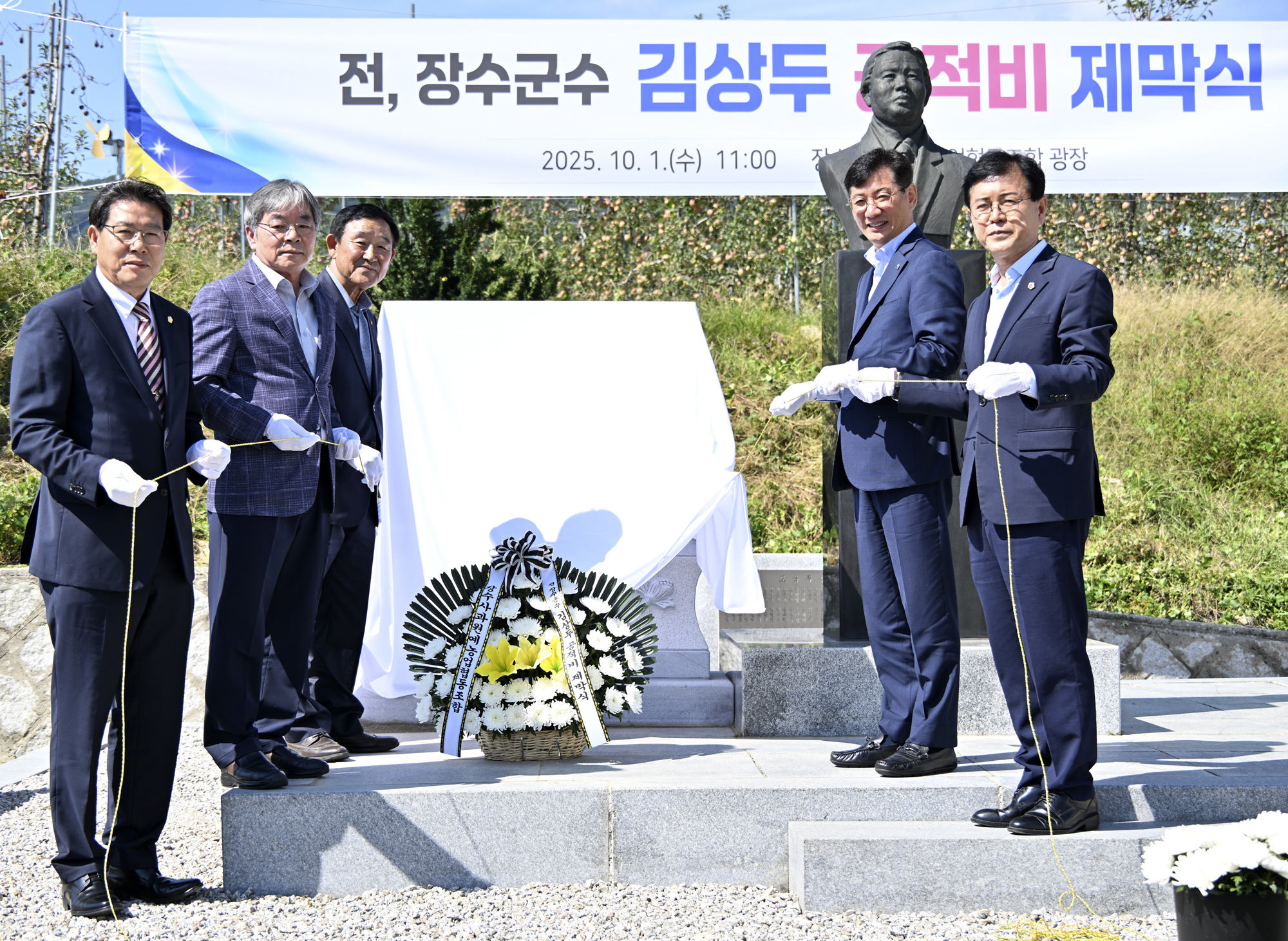 [장수=뉴전북] 장수군은 지난 1일 장수사과원예협동조합 광장에서 김상두 전 장수군수의 공적비 제막식을 거행했다고 밝혔다.