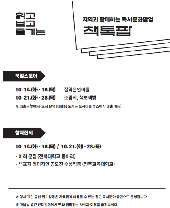 전북대는 국립대학육성사업과 글로컬대학사업의 일환으로 오는 1014일부터 23일까지 중앙도서관 앞 잔디광장에서 : 읽고, 보고, 즐기는 독서 문화 팝업을 개최한다고 13일 밝혔다.