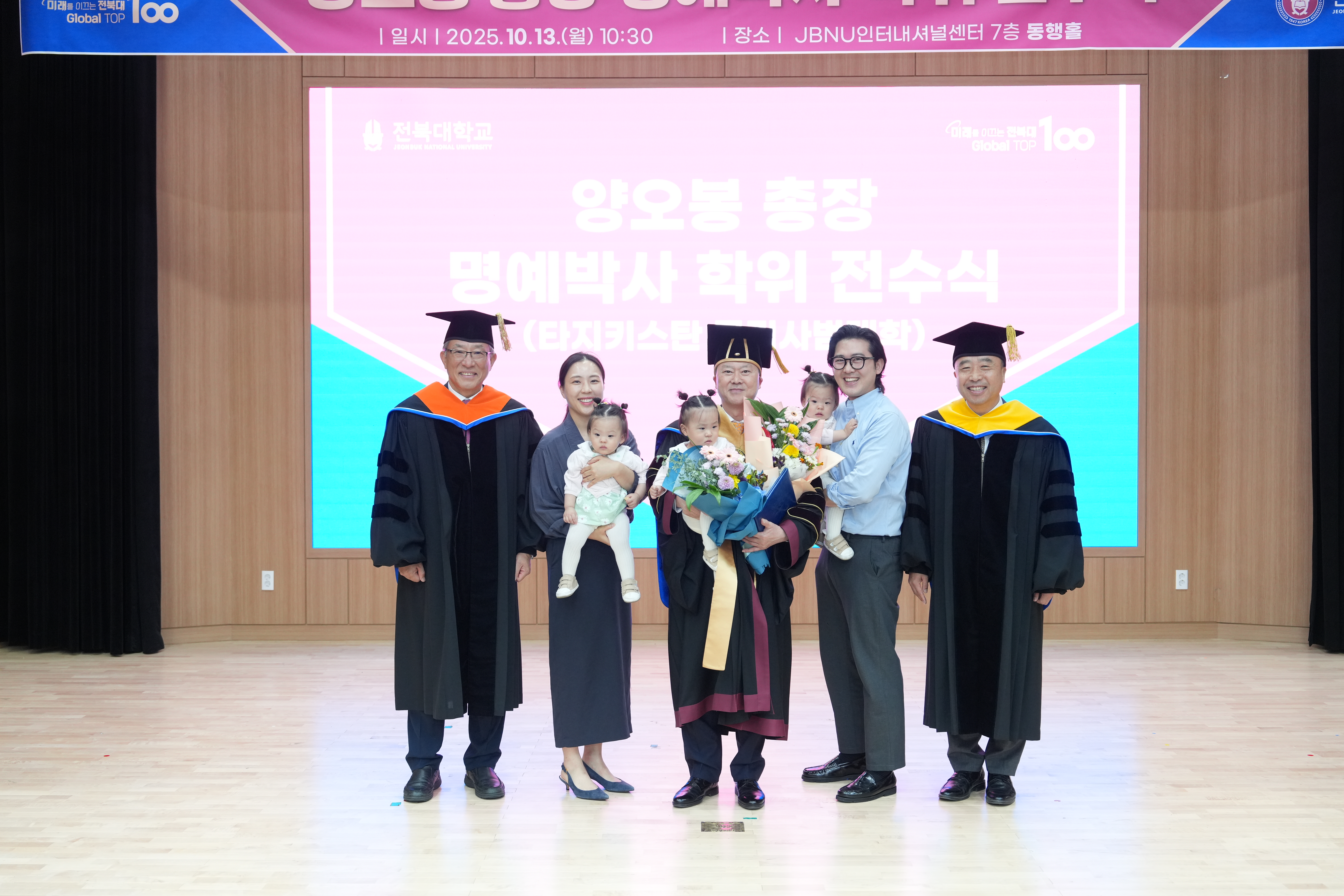 이날 함께 열린 양오봉 총장 명예박사 학위 전수식은 대학의 국제 협력 성과를 공식적으로 인정받은 자리였다. 양 총장은 최근 타지키스탄을 방문해 ‘전북대–타직국립사범대학 국제센터’와 ‘JBNU 한국어센터’ 개소를 성사시키고 교육·문화 교류 체계를 구축한 공로로 명예박사 학위를 받았다.
