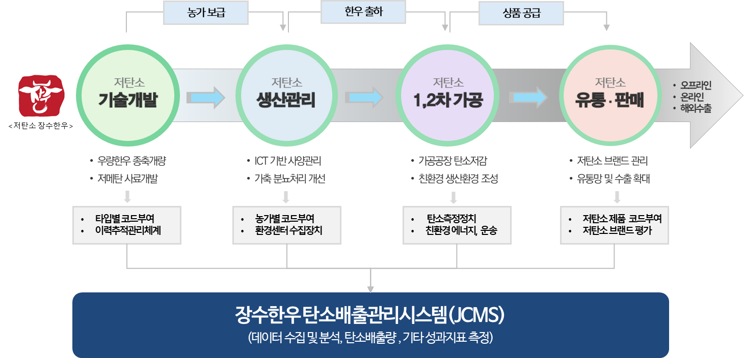 이번 사업의 핵심인 ‘장수한우 탄소배출관리시스템(JCMS)’은 한우의 사육 과정에서 발생하는 탄소를 측정·관리하고, 축산 농가별로 맞춤형 사양관리 프로그램을 제공하는 통합 플랫폼으로 생산성과 품질을 높이면서도 온실가스 배출을 줄이는 역할을 하게 된다.