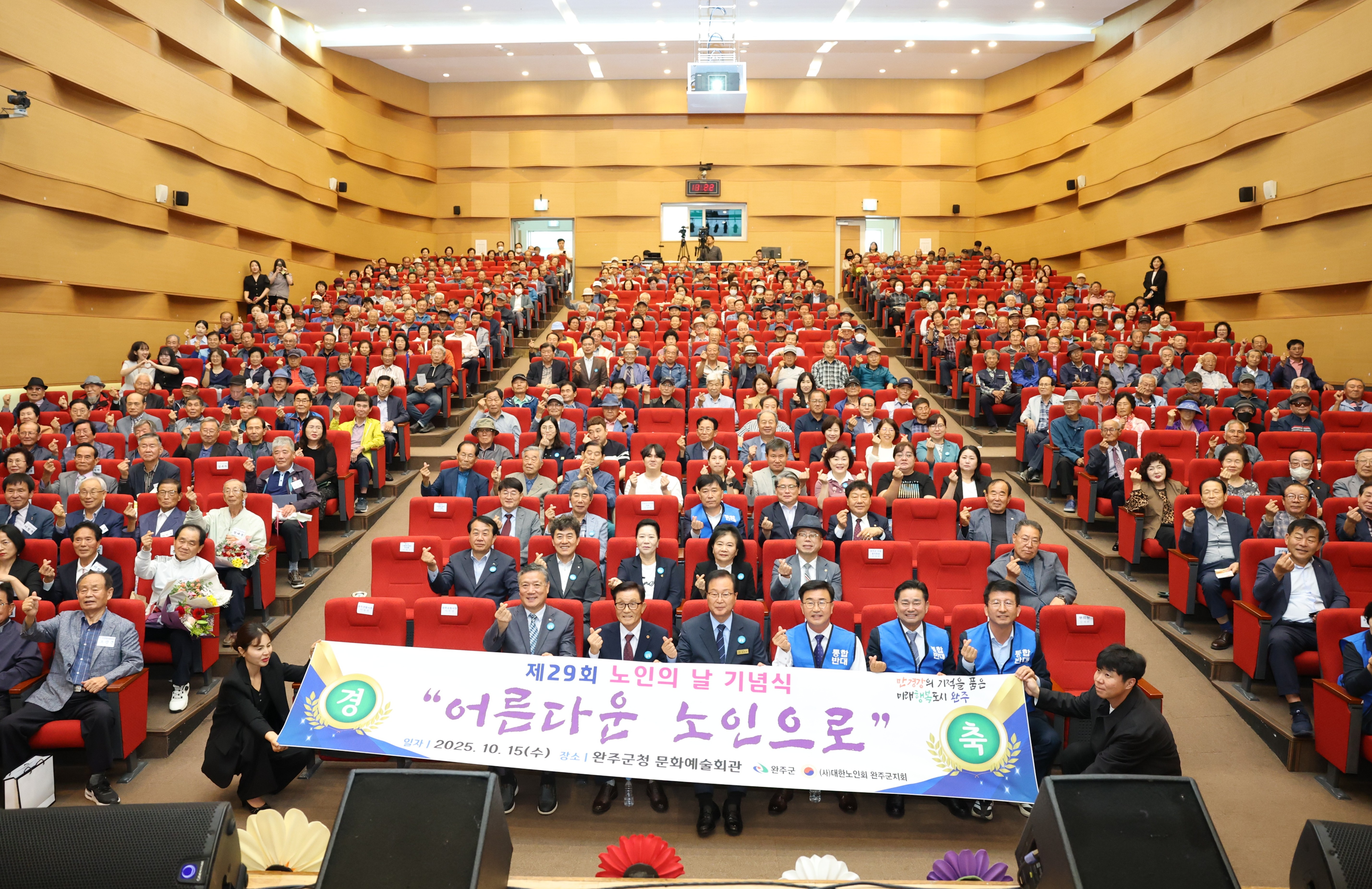 15일 완주문화예술회관에서 열린 행사에는 유희태 완주군수, 유의식 완주군의회 의장, 윤수봉·권요안 전북도의원, 조영민 완주교육지원청 교육장 등 50여 명 각 기관장과 관내 어르신과 유관기관 등 500여 명이 참석해 세대 간 존경과 화합의 의미를 되새겼다.