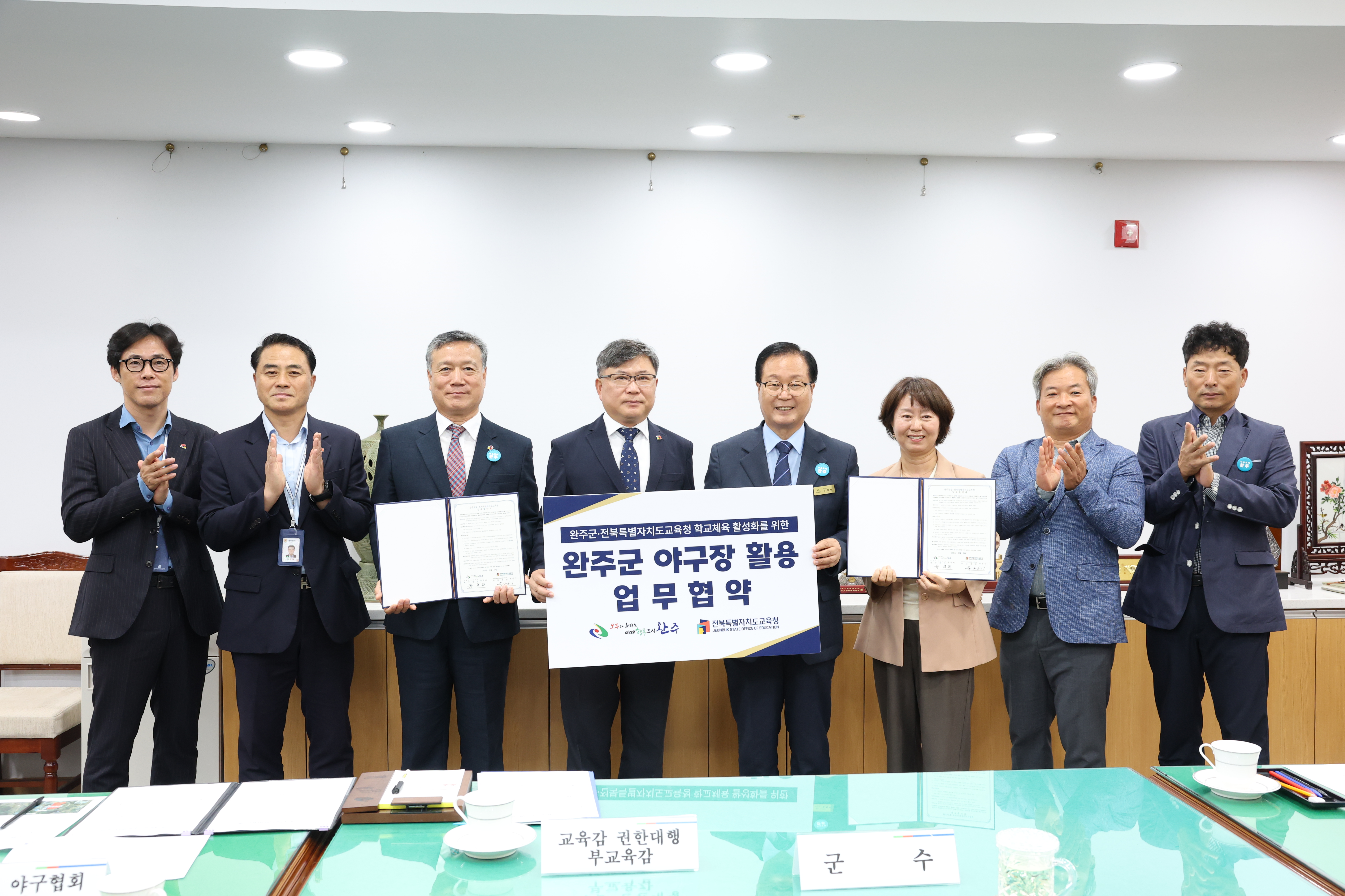 완주군청에서 열린 협약식에는 유희태 완주군수, 유정기 전북도교육청 교육감 권한대행, 김철웅 완주군 야구협회 회장 등이 함께 했다.