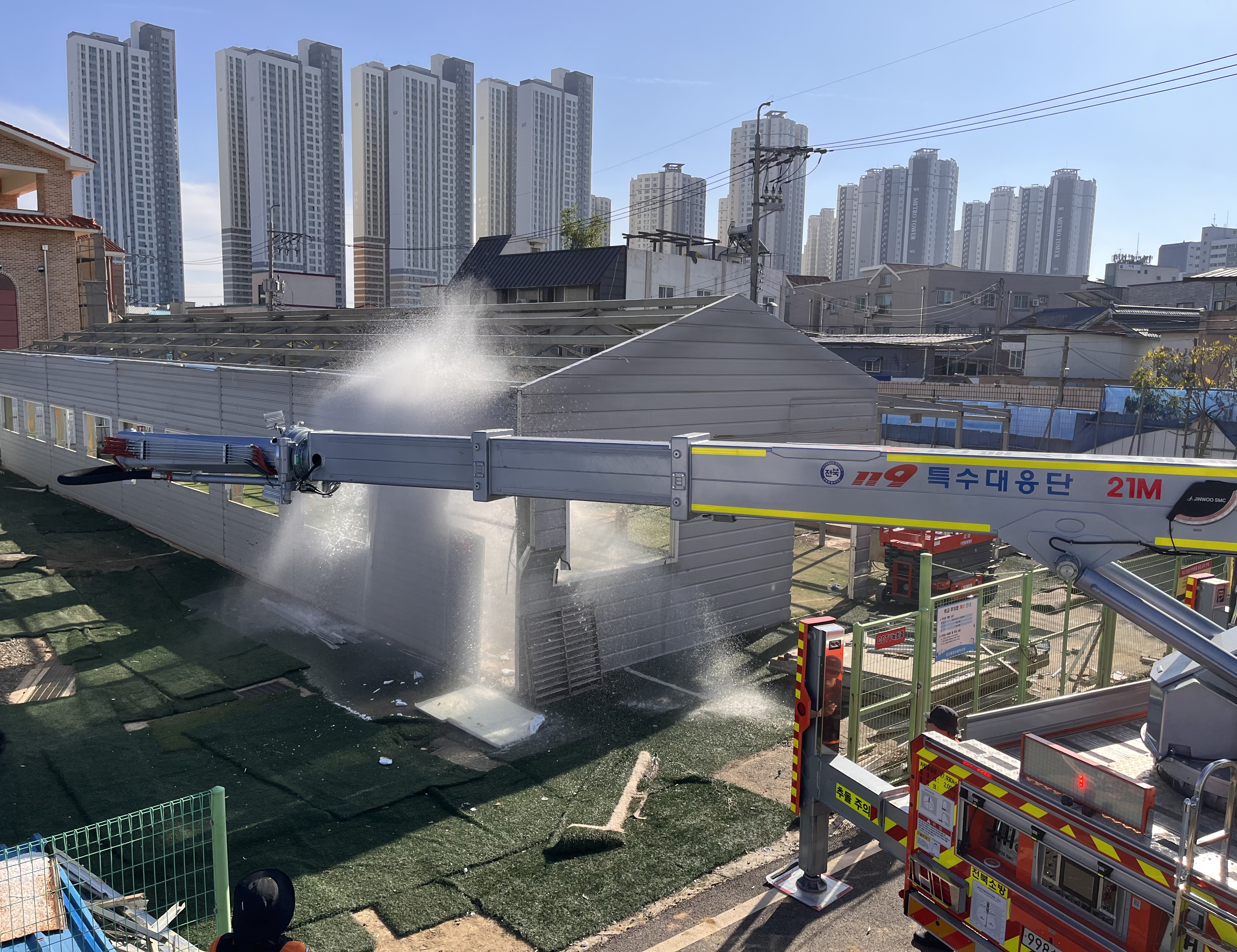 훈련에 투입된 무인파괴방수차는 원격 조종으로 최대 21미터 높이까지 노즐을 전개해 4mm 철판과 160mm 두께의 콘크리트 벽을 관통할 수 있는 고성능 장비로, 소방대원이 직접 접근하기 어려운 고열폭발 위험 현장에서도 외벽이나 천장을 뚫고 내부에 소화용수를 직접 분사할 수 있다.