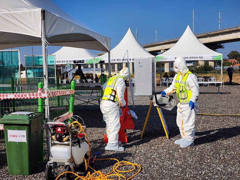 군산시 및 관계기관들도 현장훈련을 통해 의심축 신고에 따른 초동 대응 및 준비사항 점검 의사환축 확인 및 대응 살처분 상황 해제 사후관리 순으로 방역조치 전 과정을 점검했다.