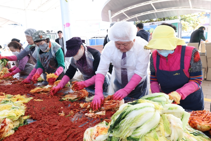 행사에는 황인홍 무주군수와 오광석 무주군의회 의장 등 주요 인사들과 상인 등 100여 명이 김장 버무리기와 포장 등에 동참했다.
