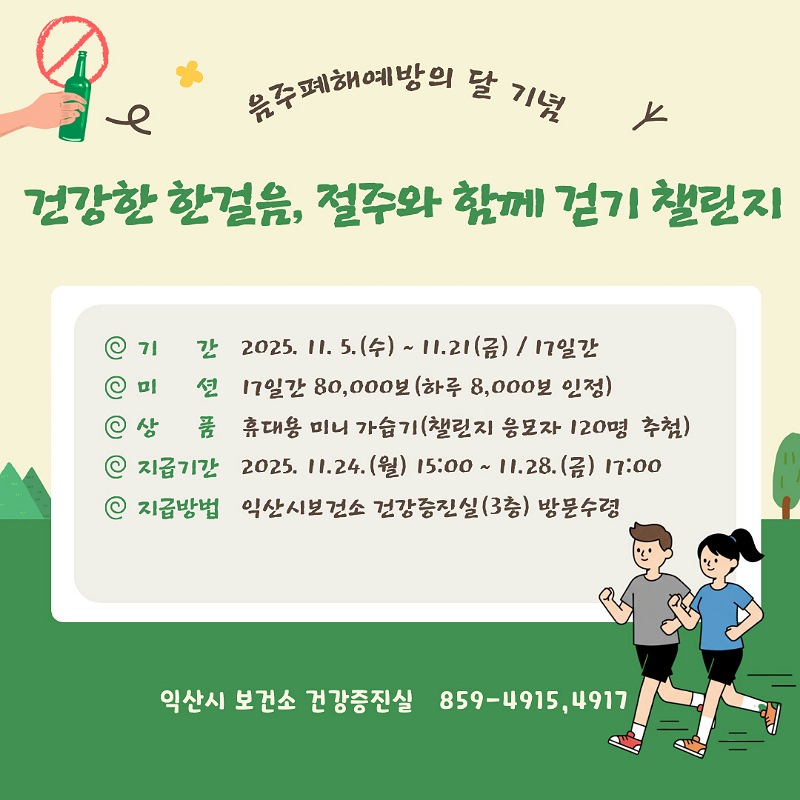 [익산=뉴전북] 익산시 보건소는 '11월 음주폐해예방의 달'을 맞아 5일부터 '건강한 한 걸음! 절주와 함께 걷기 챌린지'를 추진한다.