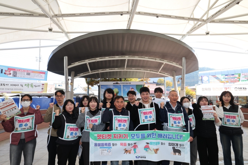 [사회=뉴전북] 무주군이 6일 무주읍 반딧불시장에서 관련 공무원 등 20여 명이 동참 한 가운데 펫티켓 캠페인을 진행했다.