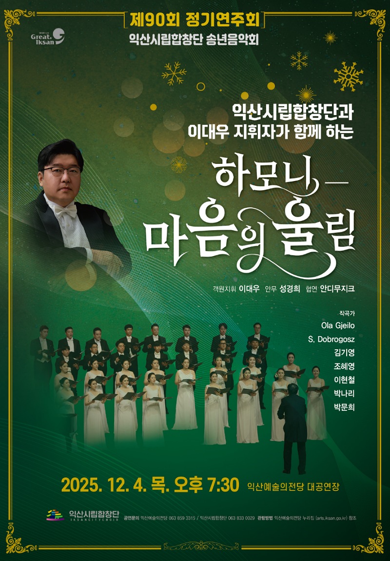 익산시립합창단은 12월 4일 오후 7시 30분, 제90회 정기연주회 '하모니-마음의 울림'을 익산예술의전당 대공연장 무대에 올린다.