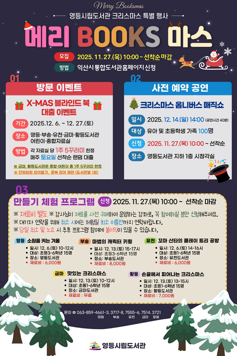 익산시는 '메리 북스(BOOKS) 마스'를 주제로 12월 영등·부송·유천·금마·황등 5개 시립도서관에서 다채로운 독서문화 행사를 운영한다.