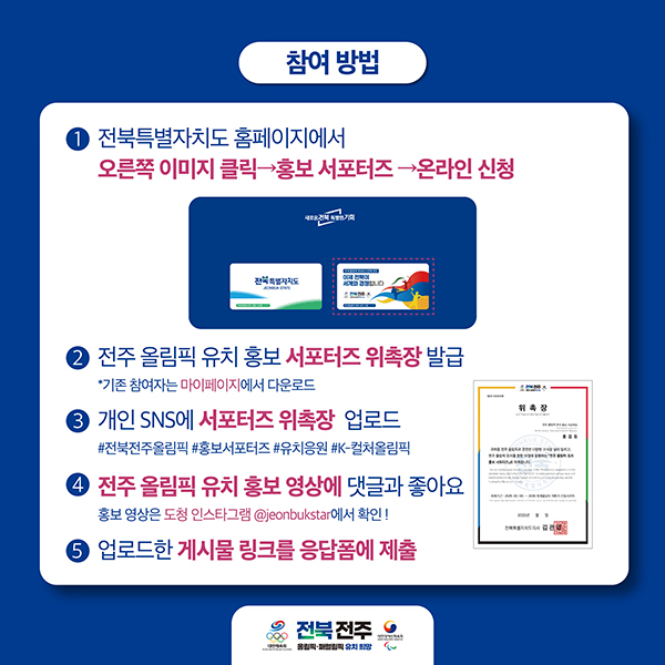 이번 인증 이벤트는 서포터즈 가입 후 발급받은 위촉장을 개인 SNS에 지정 해시태그(#전북전주올림픽, #홍보서포터즈, #올림픽유치응원)와 함께 게시하고, 새로 제작된 전주 올림픽 유치 홍보 영상에 '좋아요'와 응원 댓글을 남긴 뒤, 네이버 폼으로 참여 신청을 마치면 된다.
