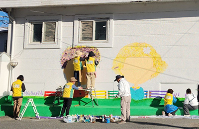 신천지자원봉사단 군산지부가 지난 10월 장미동 일대 한 건물의 낡은 외벽에 벽화를 그리고 있다.