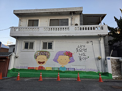 군산지부는 바닥부터 벽과 지붕까지 오래된 페인트를 긁어내기와 물청소 등 밑 작업을 진행했다. 이어 ‘네가 웃으면 나도 좋아’라는 글귀와 함께 활짝 웃는 두 아이 모습을 그려냈다.