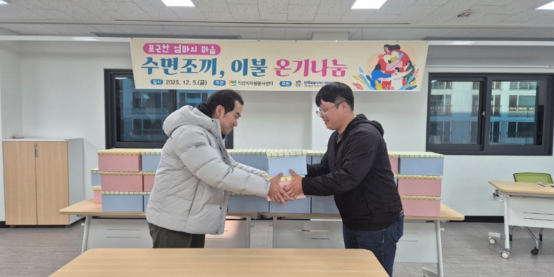 ㈔익산시자원봉사센터(이사장 엄양섭)는 5일 '포근한 엄마 맘 수면조끼 온기나눔' 전달식을 열고, 영유아를 위한 수면조끼와 이불 지원에 나섰다.