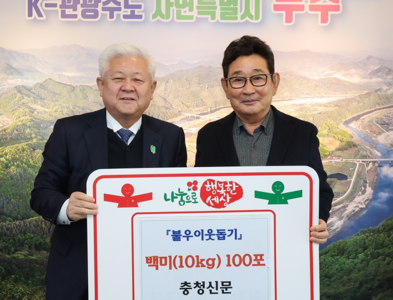 | 충청신문 김충헌 대표가 9일 무주군에 쌀 100포대(1포대 10kg)를 기탁했다. |