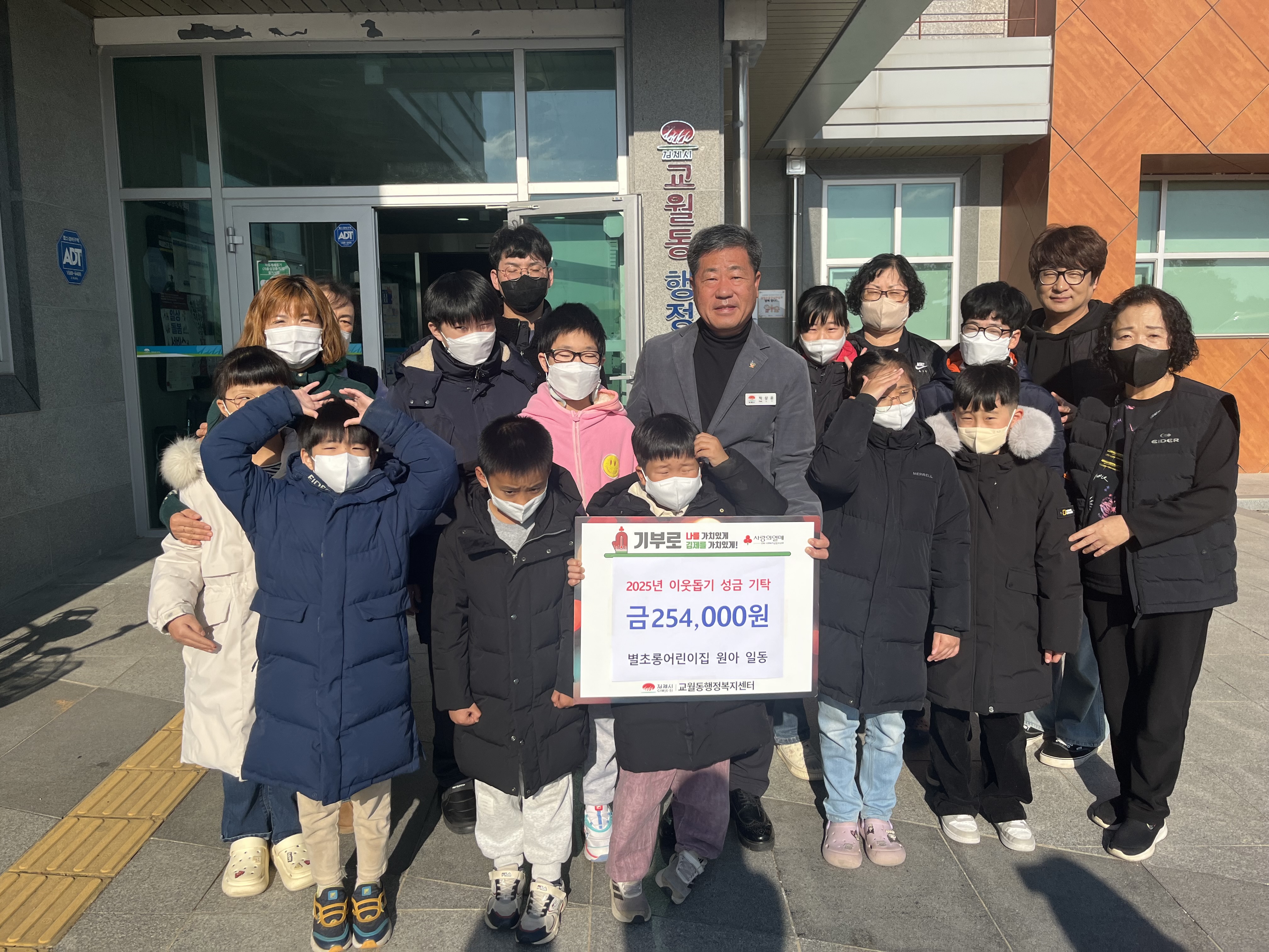 [김제=뉴전북]김제시 교월동 행정복지센터는 별초롱 어린이집(원장 김옥주)이 지난 9일 지역사회 나눔 실천을 위해 어려운 이웃에 써달라며 기탁금 25만 4천원을 기탁했다고 밝혔다.