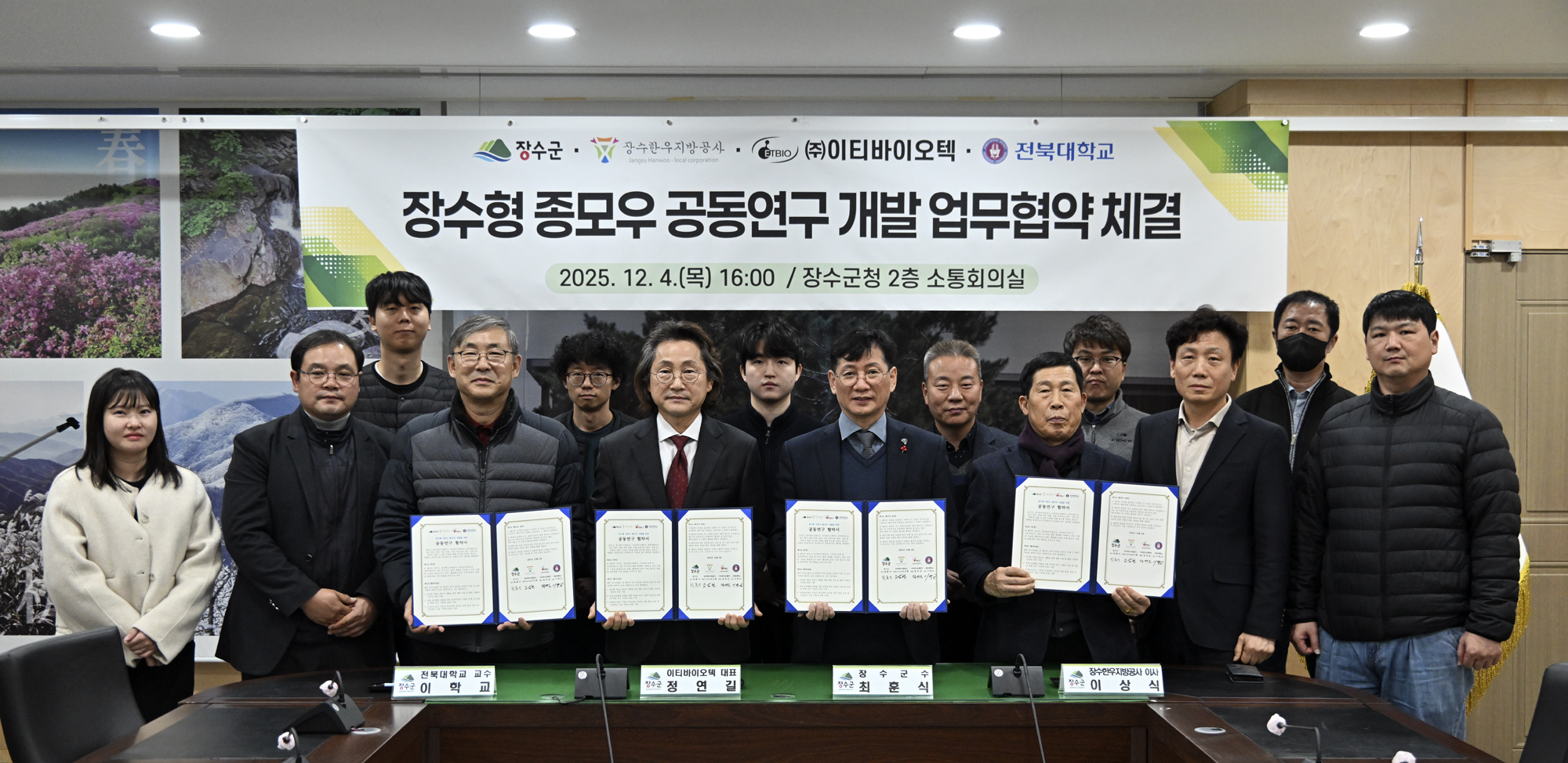 [장수=뉴전북] 장수군은 장수한우지방공사, 이티바이오텍(주), 전북대학교와 장수군청 회의실에서 장수한우 품질 고급화를 위한 ‘장수형 저탄소 종모우 개발’ 공동연구 상호협력 업무협약(MOU)을 체결했다고 11일 밝혔다.