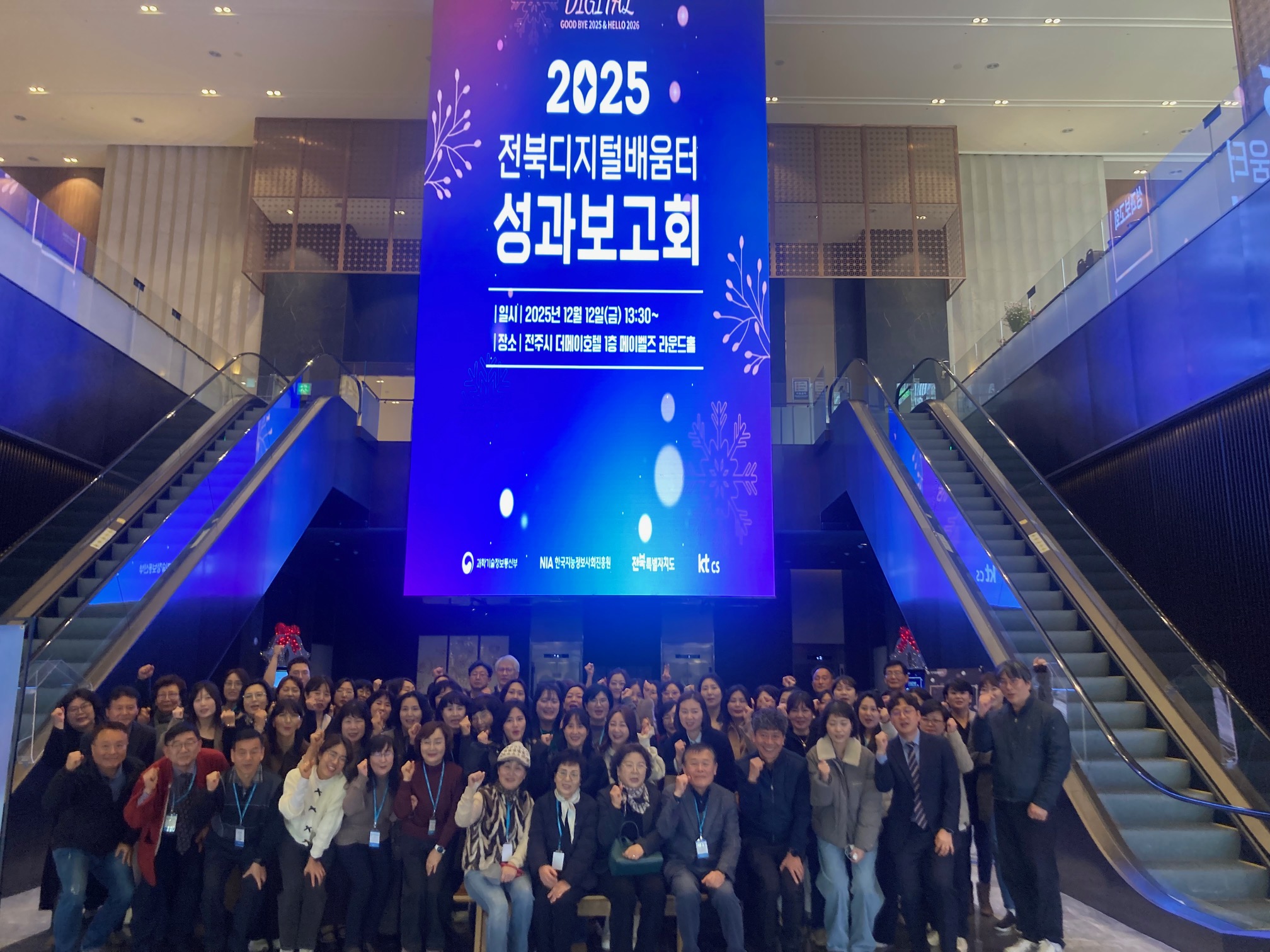 [도정=뉴전북] 전북특별자치도가 12일 전주 더메이호텔에서 한국지능정보사회진흥원(NIA), 도내 14개 시·, 운영사(KTcs), 강사 등 100여 명이 참석한 가운데‘2025 전북 디지털배움터 성과보고회를 열고, 운영 성과 공유와 우수 강사·가이드 시상을 진행했다.