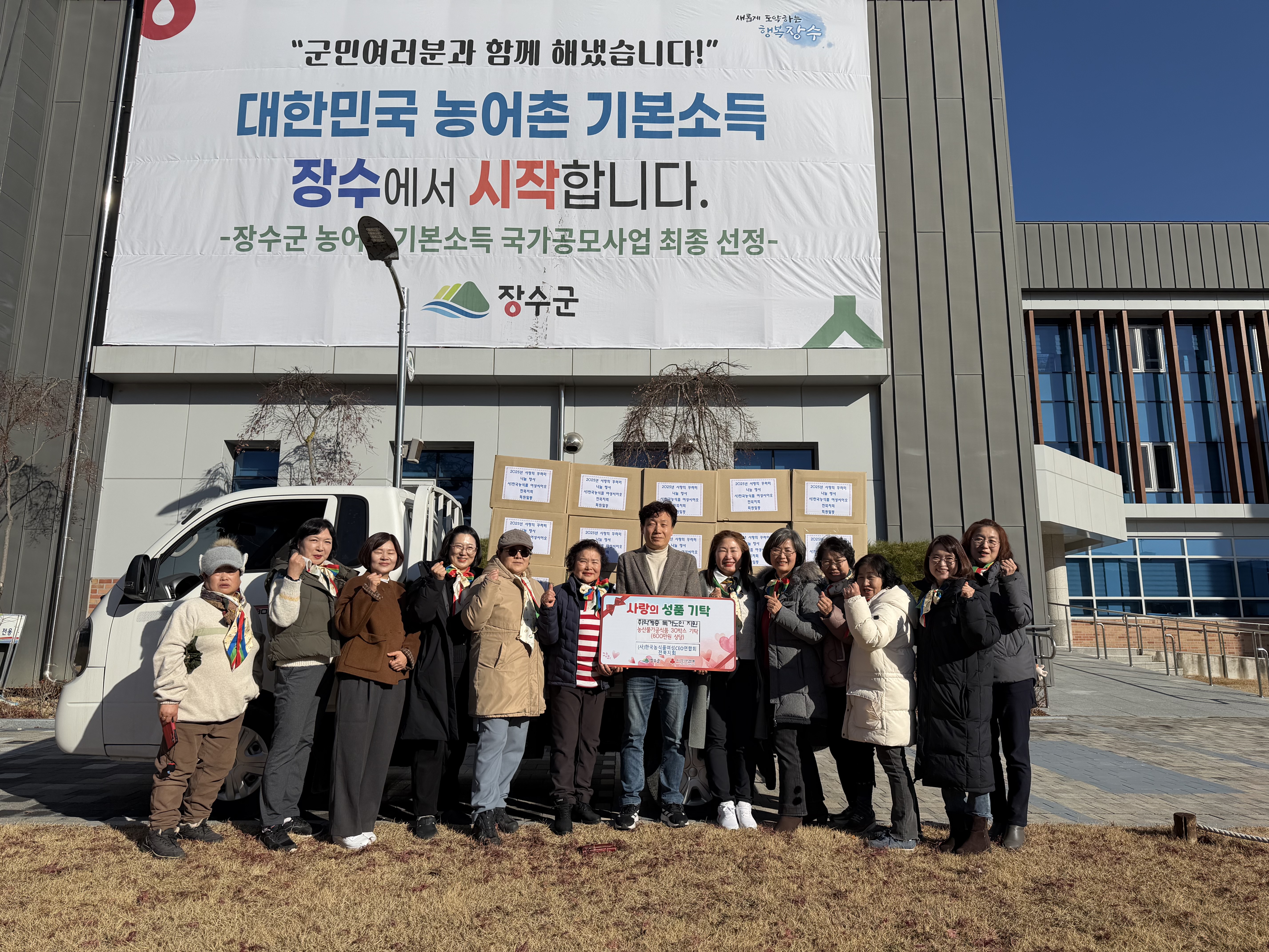 [장수=뉴전북] 장수군은 ()한국농식품여성CEO연합회 전북도지회가 지난 12일 지역 취약계층을 위해 농산물 가공식품 꾸러미 30박스(600만 원 상당)를 기탁했다고 밝혔다.