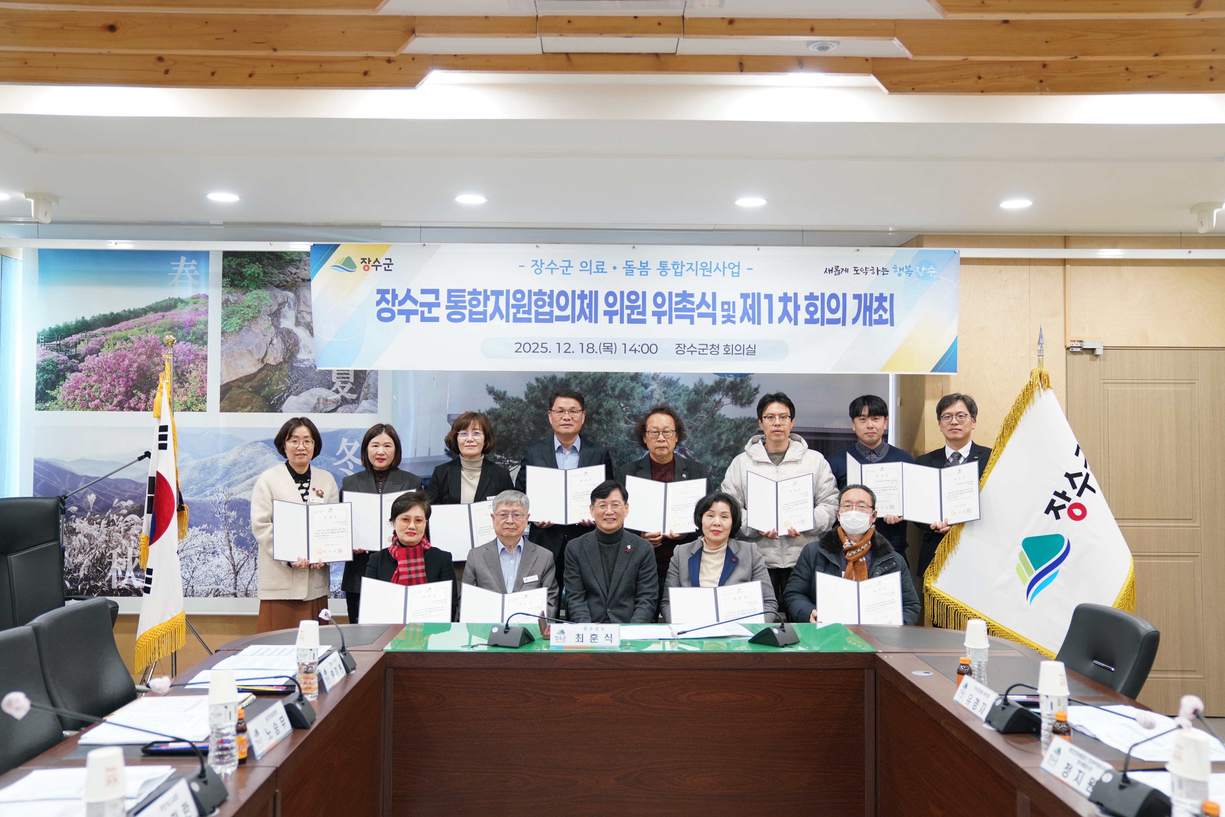 [장수=뉴전북] 장수군은 지난 18일 장수군청 회의실에서 제1기 장수군 통합지원협의체 위원 위촉식 및 제1차 회의를 개최하고 지역 중심의 통합돌봄 체계 구축을 위한 본격적인 출발을 알렸다고 밝혔다.