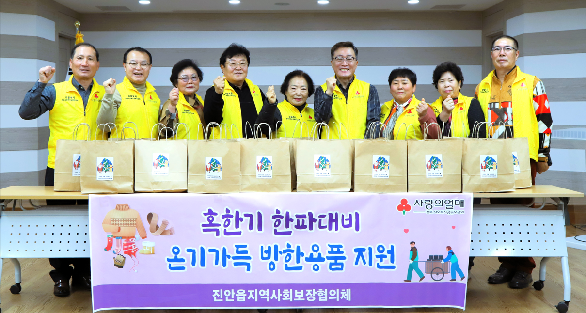 이번 사업은 겨울철 한파에 취약한 저소득 가구의 건강유지를 위하여 마련된 것으로, 관내 저소득 취약계층 24가구를 대상으로 방한 모자와 조끼를 지원하였다. 특히 실생활에 활용도가 높은 방한용품을 진안읍 지사협 위원들이 직접 전달하고 안부를 살피는 등 이웃사랑을 실천해 온정을 나눴다.