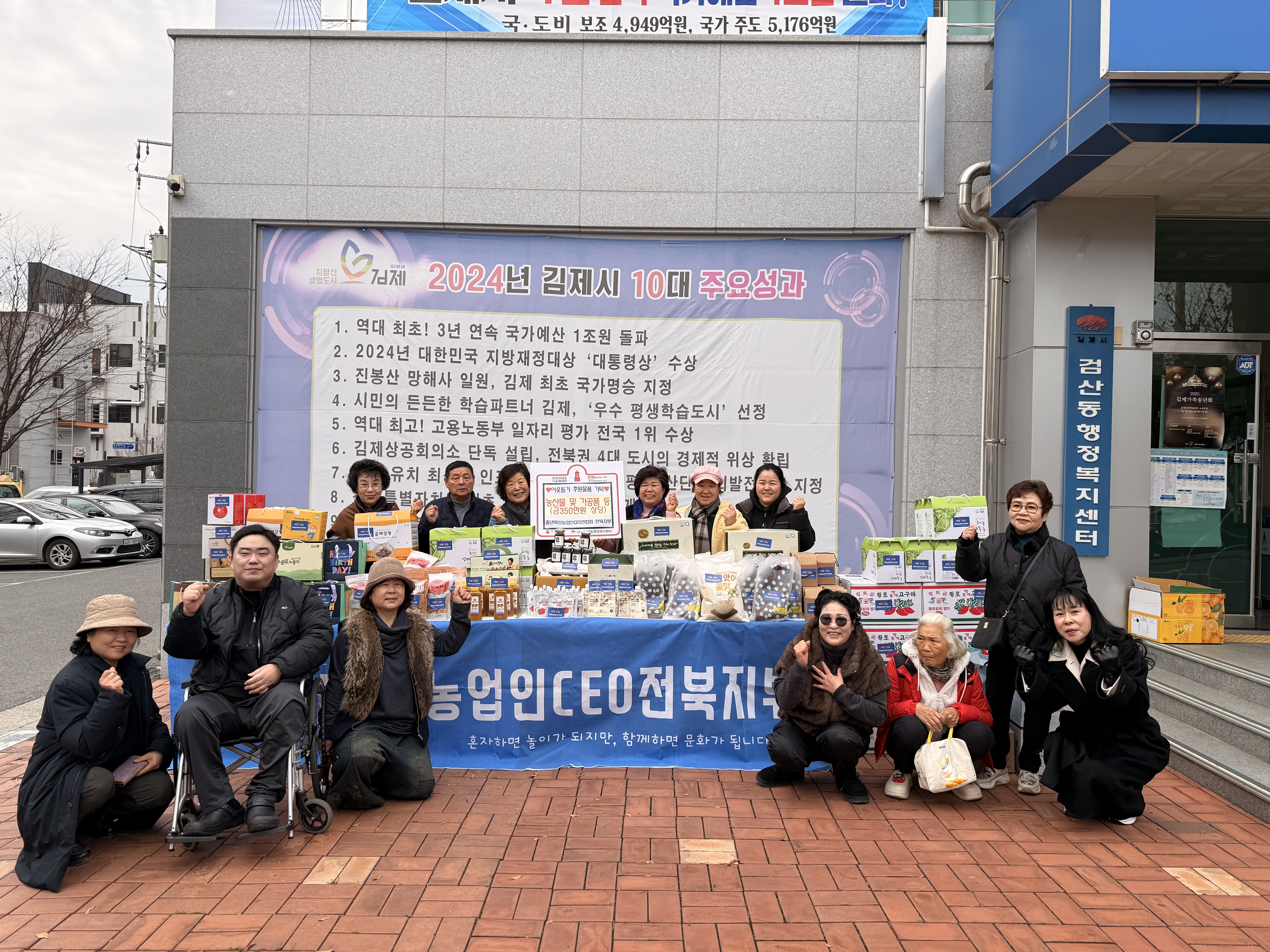 [김제=뉴전북]김제시 검산동 행정복지센터는 중년여성농업인CEO연합회 전북지부(지부장 이순덕)가 23일, 회원들이 직접 제조한 농산물 및 가공품 등 금350만 원 상당의 후원물품을 기탁했다고 밝혔다.