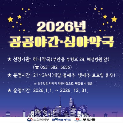 [의학·건강=뉴전북] 부안군은 2026년에도 군민들의 건강 보호 강화를 위해 공공심야약국을 운영한다고 발표했다.