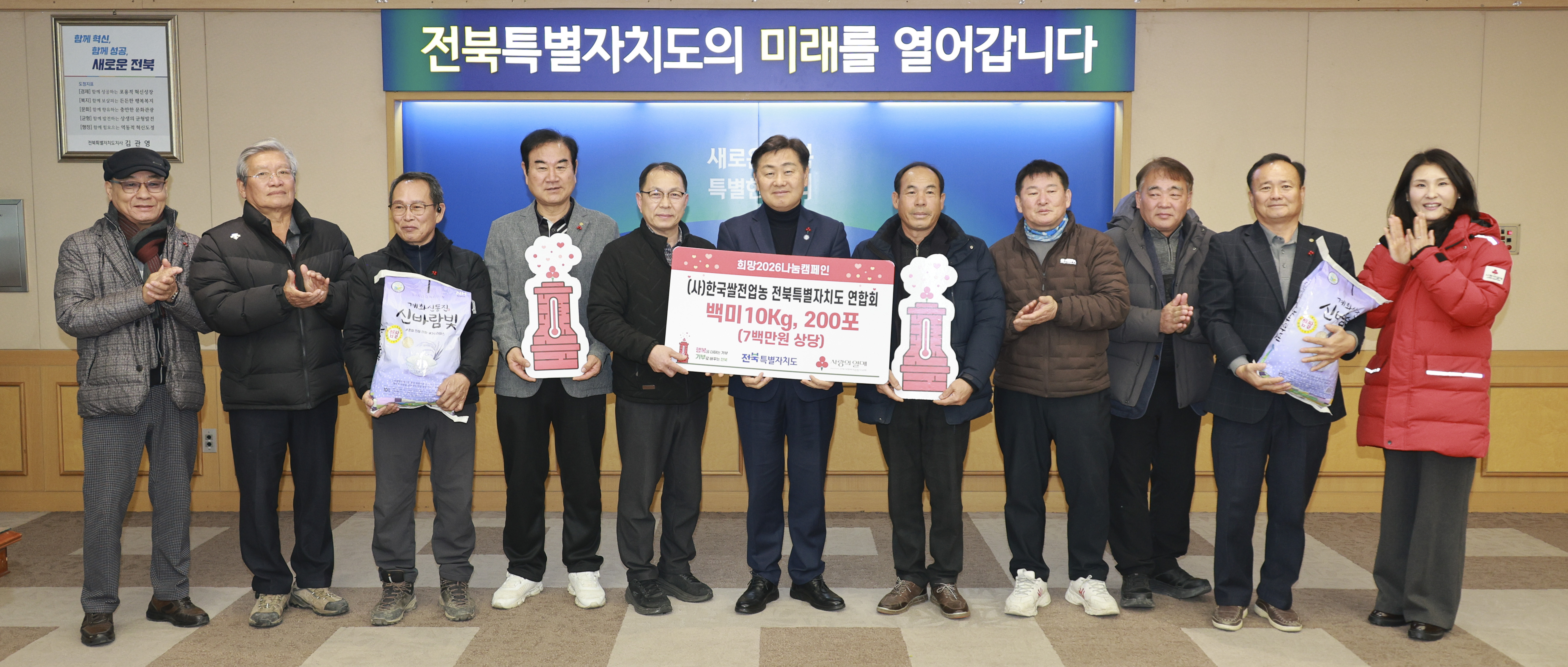 김관영 전북특별자치도지사는 농업인의 정성과 땀이 담긴 쌀을 어려운 이웃에게 나누어 주신 쌀 전업농 전북특별자치도 연합회 여러분께 깊이 감사드린다,“전북도는 앞으로도 농업인과 도민이 함께 연대하고, 나눔이 일상이 되는 따뜻한 지역공동체를 만들어 가겠다고 말했다.