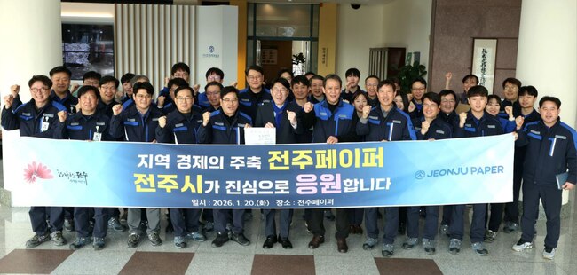 우범기 전주시장이 2026년 새해를 맞아 ‘강한 경제’ 구현을 위해 지역 경제의 든든한 버팀목인 향토기업을 찾아 전주지역 대표 장수기업인 전주페이퍼(대표이사 심철식) 전주공장을 방문해 생산 현장을 둘러보고, 기업 경영의 애로사항을 청취했다.