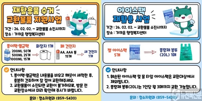 아울러 아이스팩 재활용 사업도 함께 운영된다. 젤 타입 아이스팩 5개를 제출하면 종량제 봉투 20L 1매로 교환할 수 있으며, 1인당 월 최대 3매까지 가능하다. 훼손된 아이스팩과 물 타입 아이스팩은 교환 대상에서 제외된다.