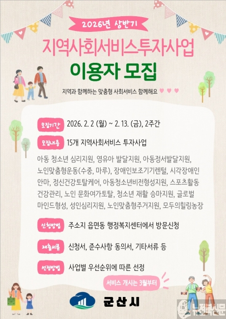 [군산=뉴전북] 군산시가 2026년 상반기 지역사회서비스 투자사업 이용자를 오는 2일부터 13일까지 2주간 모집한다.