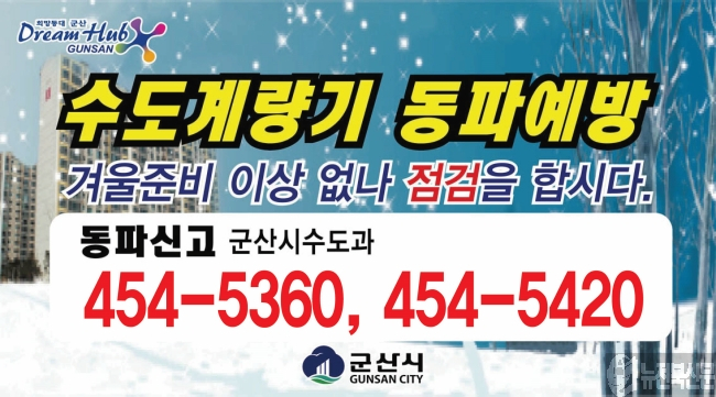 한편 동파로 인한 계량기 교체가 필요할 경우 군산시청 수도과(063-454-5360, 5420)로 신고하면 된다.