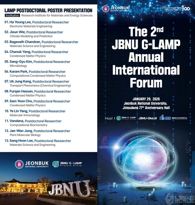 전북대 G-램프(LAMP)사업단은 오는 29일 전북대 진수당 77주년 기념홀에서 ‘두 번째 국제 기초과학 성과포럼’을 개최한다고 밝혔다. 이번 포럼은 지난해 2월 처음 열린 국제 기초과학 성과포럼에서 확장된 선도 연구자 네트워크를 활용해 기초과학 성과 공유가 한층 확장된 자리다.