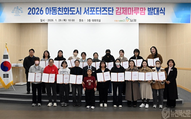 [김제=뉴전북]김제시는 2026년 제3대 아동친화도시 서포터즈단 김제마루맘’ 발대식을 29일 오전 개최했다고 밝혔다이날 행사는 정성주 시장과 선발된 김제마루맘 단원관계자 등 25여 명이 참석했다.